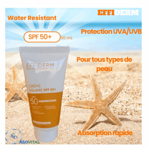 Effiderm Crème Solaire SPF50+ 50ml est une protection solaire visage et corps à très haute tolérance, idéale pour les peaux sensibles ou réactives. Grâce à sa formule enrichie en filtres organiques et actifs hydratants, elle forme un bouclier efficace contre les rayons UVA et UVB tout en prévenant le vieillissement cutané prématuré. Sa texture légère et non grasse pénètre rapidement sans laisser de film blanc. Résistante à l’eau et sans parfum ajouté, elle convient à un usage quotidien pour une protection optimale au soleil, en ville comme en plein air.