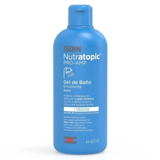 Nettoyage en Douceur et Prévention des DémangeaisonsCe gel de bain nettoie délicatement la peau, évitant les démangeaisons et les irritations souvent associées à l’hygiène des peaux atopiques. Il maintient le pH naturel de la peau, un facteur clé pour prévenir de nouvelles poussées d’irritation. De plus, sa formulation sans savon, conservateurs, parfums ni colorants assure un respect optimal de la sensibilité cutanée. Hydratation Profonde et Protection RenforcéeEnrichi en huiles émollientes, l’Isdin Nutratopic Pro-AMP Gel de Bain offre une hydratation en profondeur, aidant à restaurer la barrière cutanée et à réduire la sécheresse. La présence de Rhamnosoft dans sa composition inhibe le risque d’adhérence bactérienne, contribuant ainsi à protéger la peau des infections potentielles. Conseils d’UtilisationPour une efficacité optimale, appliquez quotidiennement le gel sur la peau humide lors du bain ou de la douche. Massez délicatement pour faire mousser, puis rincez abondamment à l’eau. Cette routine permet de nettoyer la peau en douceur tout en préservant son hydratation naturelle. Composition Aqua (eau), Paraffinum Liquidum (huile minérale), Sodium Laureth Sulfate, PEG-120 Methyl Glucose Dioleate, Acrylates/C10-30 Alkyl Acrylate Crosspolymer, Laureth-9, 1,2-Hexanediol, Betaine, Ethylhexylglycerin, Niacinamide, Caprylyl Glycol, Sodium Hydroxide, C12-13 Alkyl Lactate, Phenethyl Alcohol, Cocamidopropyl Betaine, Butyrospermum Parkii (beurre de karité), Glyceryl Laurate, Sodium Chloride, PEG-8, Isoleucine, Tocopherol, Tropolone, Biosaccharide Gum-2, Ascorbyl Palmitate, Citric Acid, Ascorbic Acid, Rosa Damascena Flower Oil.